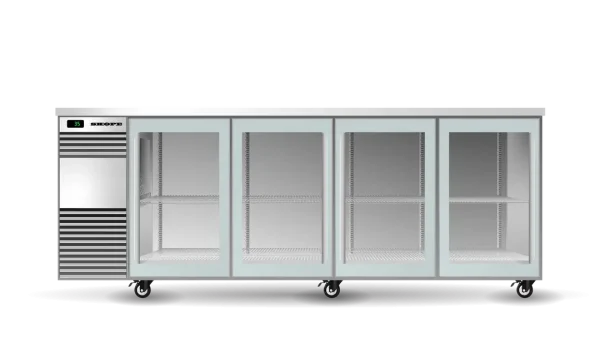 - Quiet, high efficiency premium four glass sliding door bar fridge featuring dimmable LED lights, and eco-friendly natural refrigerant technology.